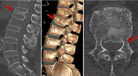 从左向右依次为CT矢状位重建图像、三维重建图像、轴位扫描图像,箭头提示腰1椎体爆裂性骨折