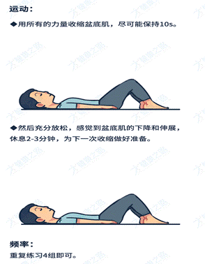 4.盆底肌训练:盆底肌训练又称凯格尔运动,是压力性尿失禁的一线治疗方法。排尿后躺平,双腿弯曲,呼吸平稳放松,持续收缩盆底肌 5-10 秒,然后放松肌肉,停留数秒,如此收缩放松反复 10 次为一组,每天训练 3-4 组,约 15 分钟,每周 3-5 次,持续 2 个月或更长时间。