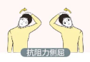 侧屈对抗:手掌置于头部一侧,头向该侧屈,同时手向反方向推,相互对抗。 (每方向重复5-8次)